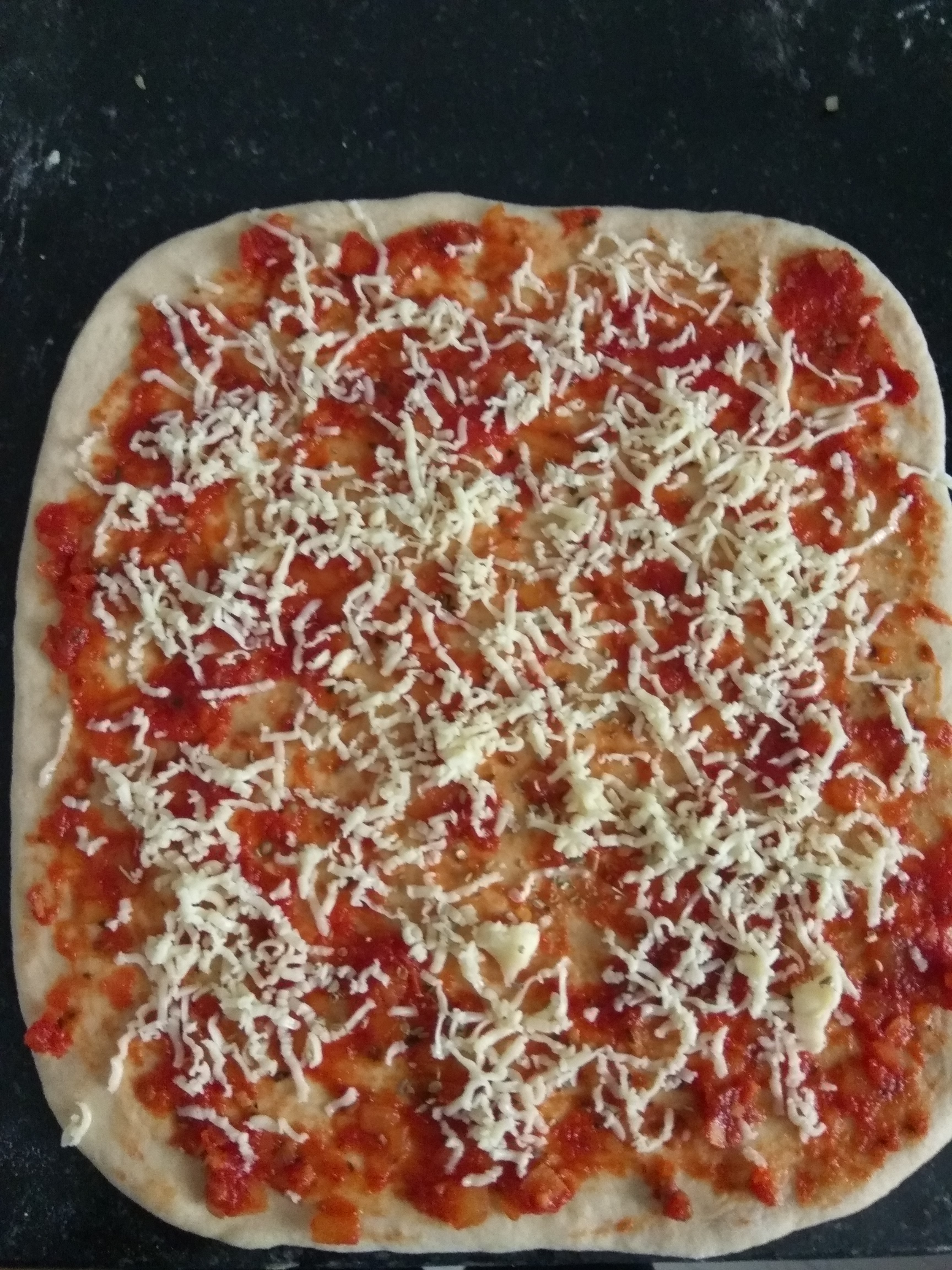 - Spread the pizza sauce evenly on the rolled dough. Sprinkle the veggies, oregano, chilli flakes and salt. Add some grated cheese on top.