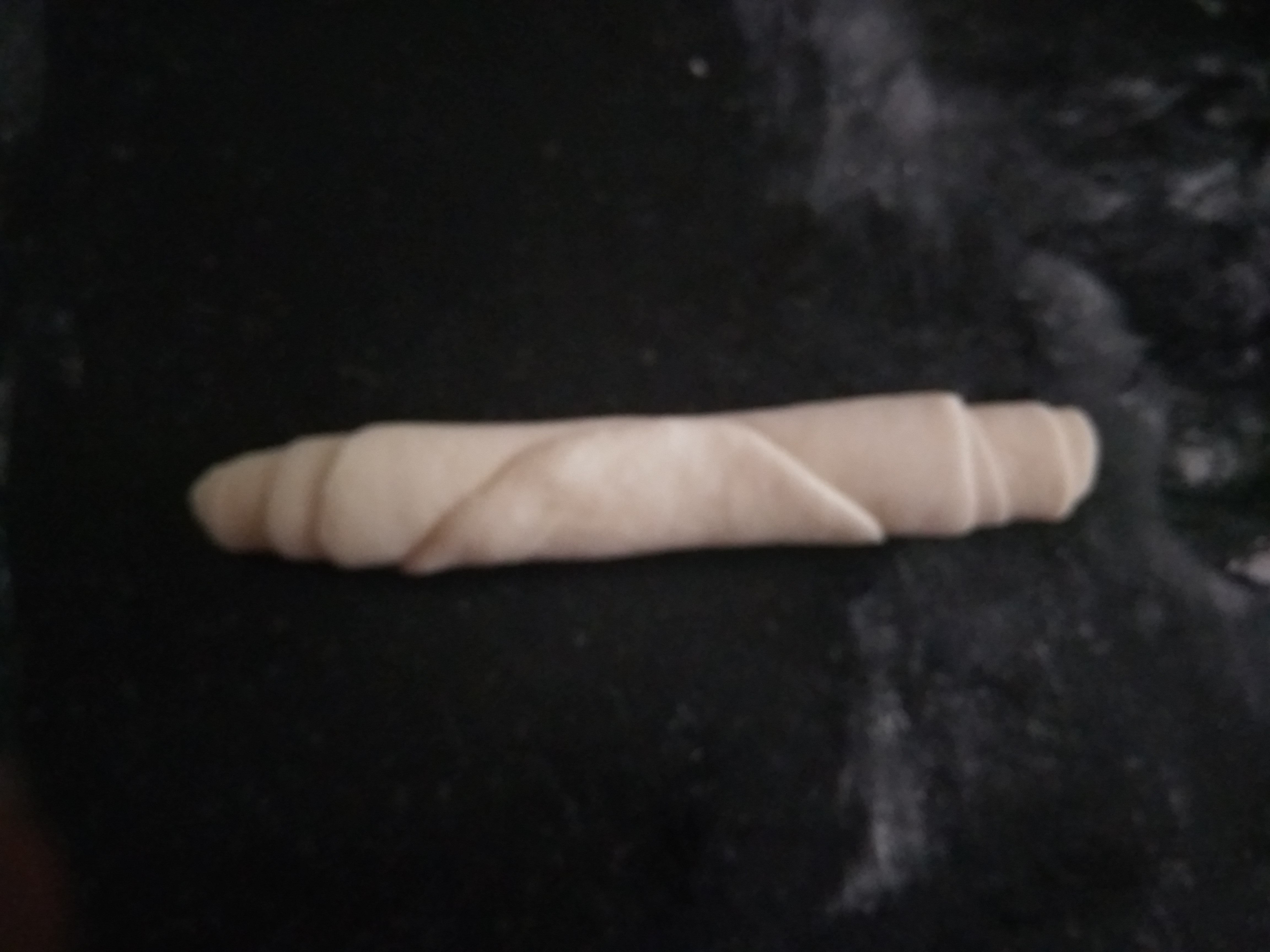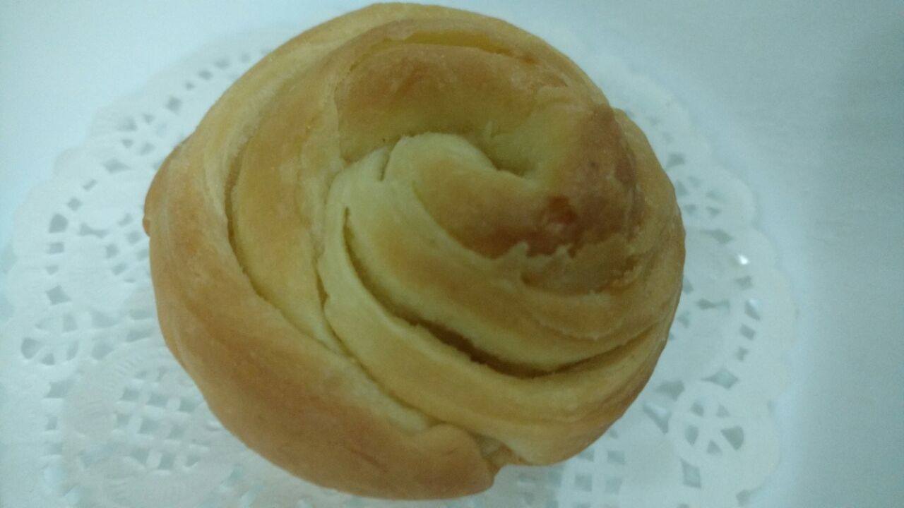 - Smear butter on the rolled oval dough and roll it tightly as shown in the picture.
