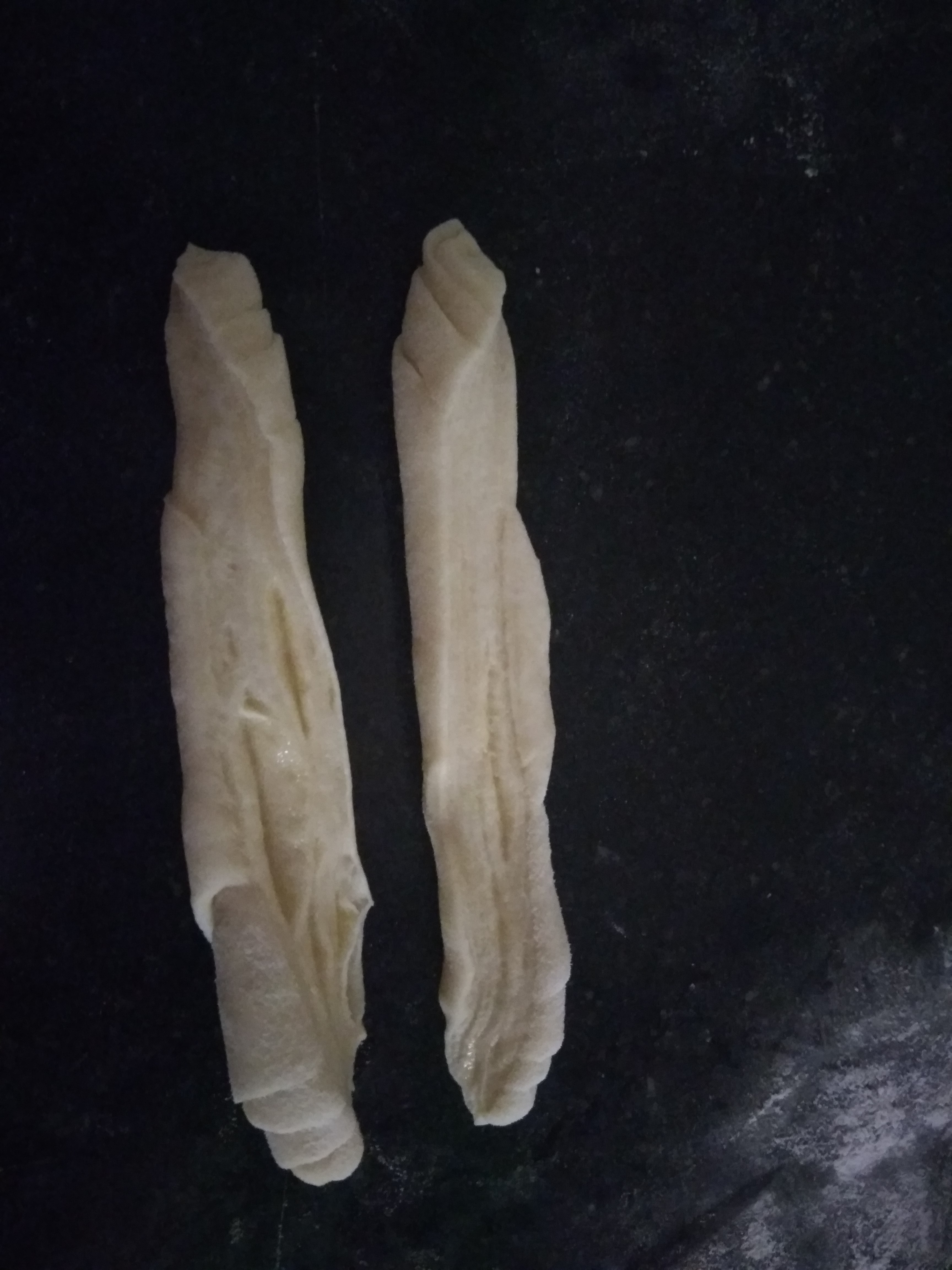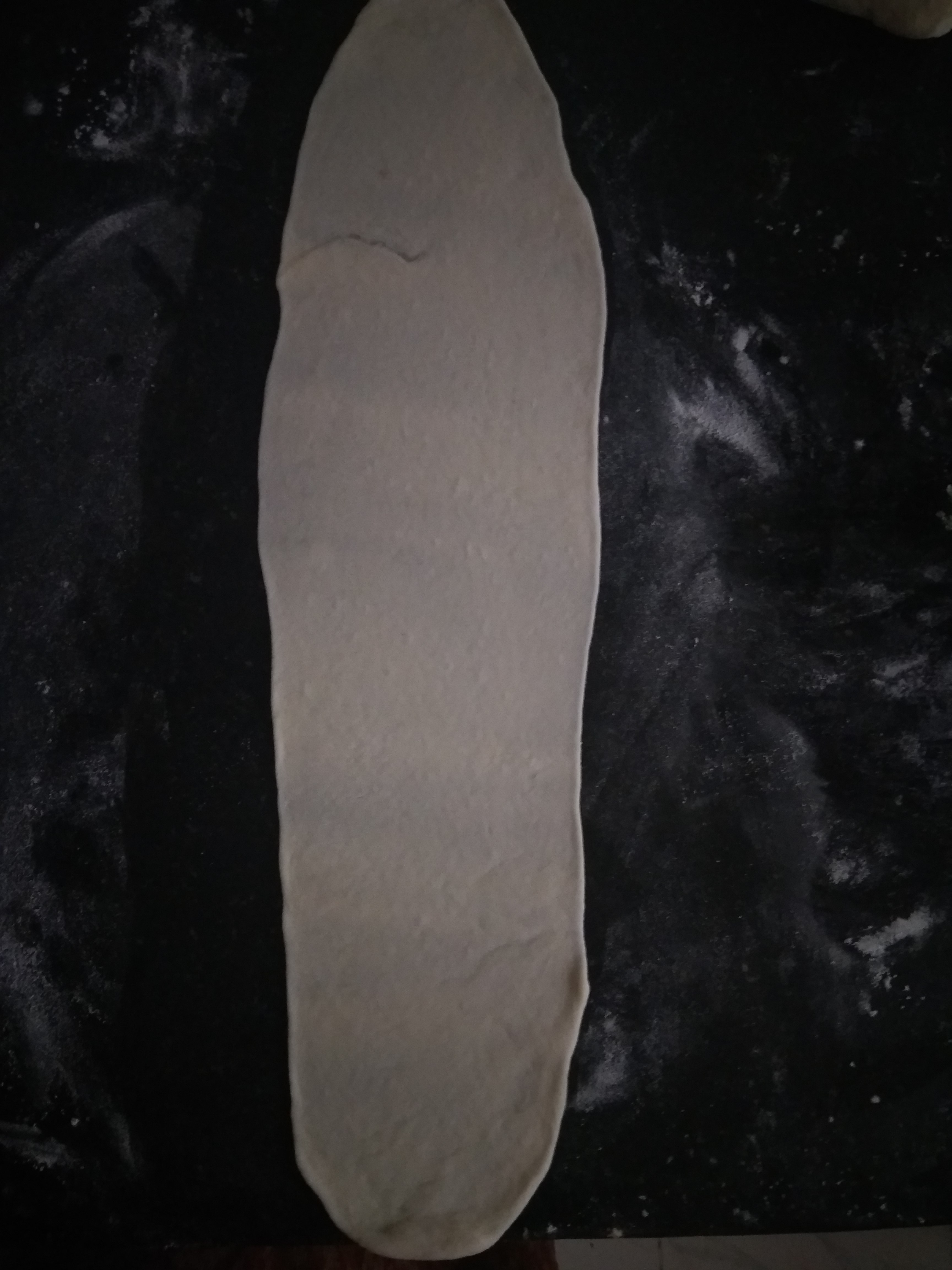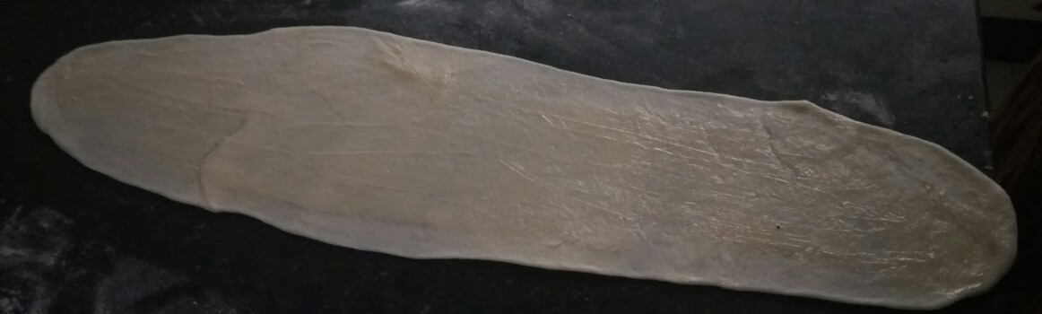 - On a nicely floured counter, roll the dough into a long oval sheet, as thin as possible.