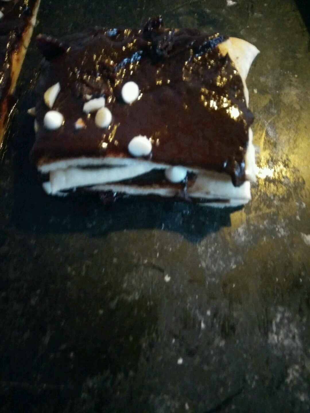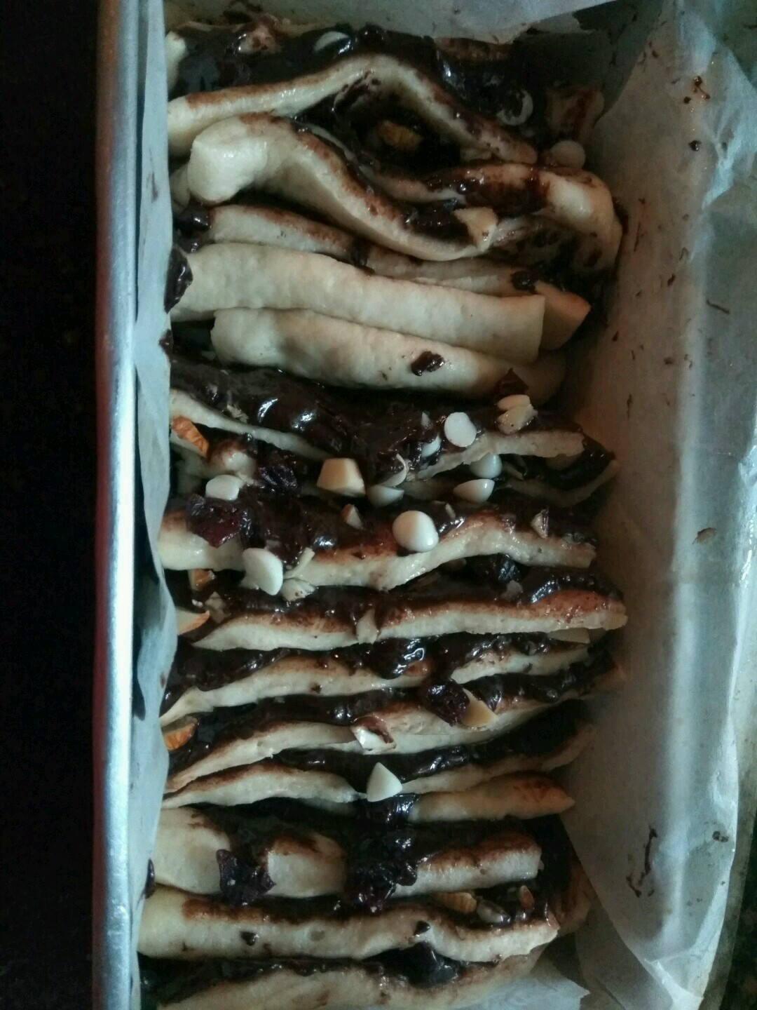 - Sprinkle some chopped cranberry, choco chips and almonds on the chocolate ganache. Make horizontal and vertical cuts on the rolled dough.